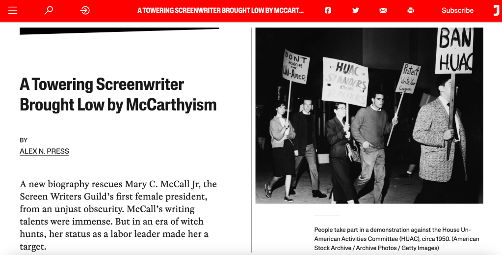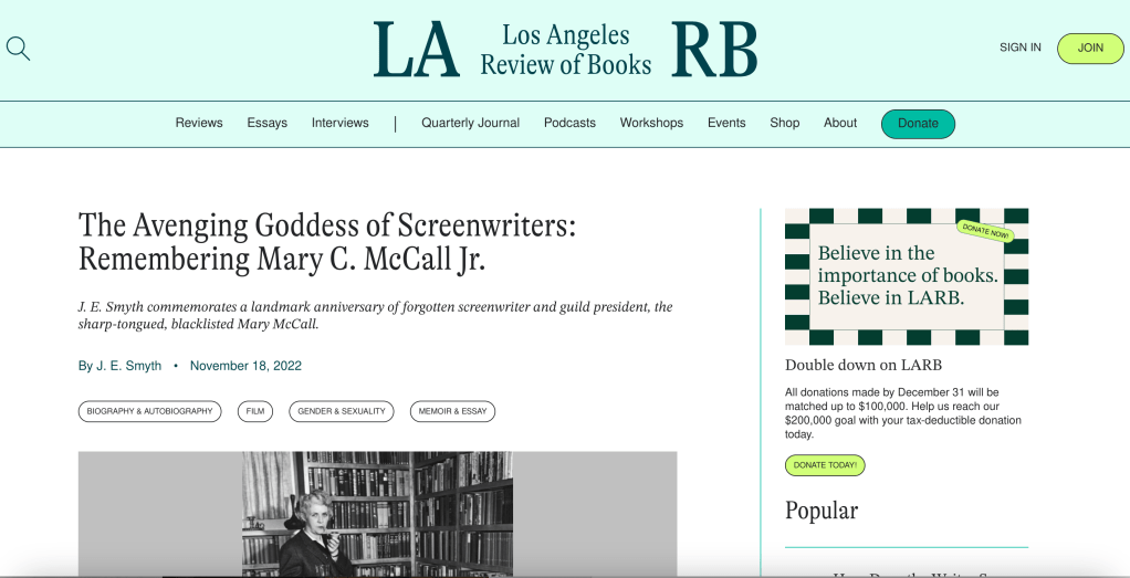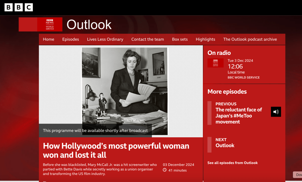 Over the years, her books have won several awards, including the Theatre Library Association’s Special Jury Prize (2019), the International Association of Media Historians’ Michael Nelson Prize (2009), and the Association of American Publishers Award (2010). In 2011-12, she was in Los Angeles as a Getty Research Institute scholar-in-residence. In 2015, she had the honour of working with producer Carolyn Pfeiffer on the award-winning PBS documentary, Children of Giant (2015). In 2021, she was named an Academy of Motion Picture Arts and Sciences film scholar for her project on Mary C. McCall Jr. The book would not have been possible without the cooperation of McCall’s daughters, network television writer Mary-David Sheiner and former Los Angeles Times film critic Sheila Benson.